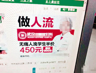 該醫(yī)院網(wǎng)頁(yè)上聲稱這是“關(guān)愛(ài)學(xué)生群體的愛(ài)心行動(dòng)”,已幫助近千名學(xué)生解決“意外”煩惱,每天前十位患者還可報(bào)銷車費(fèi)!盁o(wú)痛人流”廣告進(jìn)校園已不是什么新聞。去年一則“取環(huán)、人流、引產(chǎn)、接生,安全、可靠、放心,請(qǐng)撥打電話XXXXX”的私家“診所”廣告驚現(xiàn)某大學(xué)校園內(nèi),引起了不少網(wǎng)友議論和討伐。時(shí)至今日,這樣的現(xiàn)象非但沒(méi)有改進(jìn),反而變本加厲地蔓延開(kāi)來(lái),打廣告者也從地下“診所”變?yōu)榱苏?guī)醫(yī)院,而且還冠冕堂皇地實(shí)行半價(jià)優(yōu)惠,能不讓人憂心忡忡?