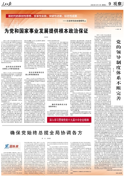 黨的十九屆六中全會(huì)通過(guò)的《中共中央關(guān)于黨的百年奮斗重大成就和歷史經(jīng)驗(yàn)的決議》,從堅(jiān)持黨的全面領(lǐng)導(dǎo)、全面從嚴(yán)治黨、經(jīng)濟(jì)建設(shè)、全面深化改革開(kāi)放、政治建設(shè)、全面依法治國(guó)、文化建設(shè)、社會(huì)建設(shè)、生態(tài)文明建設(shè)、國(guó)防和軍隊(duì)建設(shè)、維護(hù)國(guó)家安全、堅(jiān)持“一國(guó)兩制”和推進(jìn)祖國(guó)統(tǒng)一、外交工作等13個(gè)方面,分領(lǐng)域總結(jié)新時(shí)代黨和國(guó)家事業(yè)取得的歷史性成就、發(fā)生的歷史性變革。為深刻認(rèn)識(shí)和把握新時(shí)代的原創(chuàng)性思想、變革性實(shí)踐、突破性進(jìn)展、標(biāo)志性成果,本報(bào)從今天起陸續(xù)刊發(fā)系列觀察版。今天刊發(fā)的3篇文章,以新時(shí)代在堅(jiān)持黨的全面領(lǐng)導(dǎo)上取得的歷史性成就、發(fā)生的歷史性變革為主題進(jìn)行闡述。
